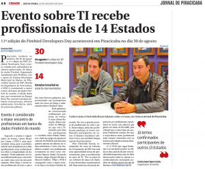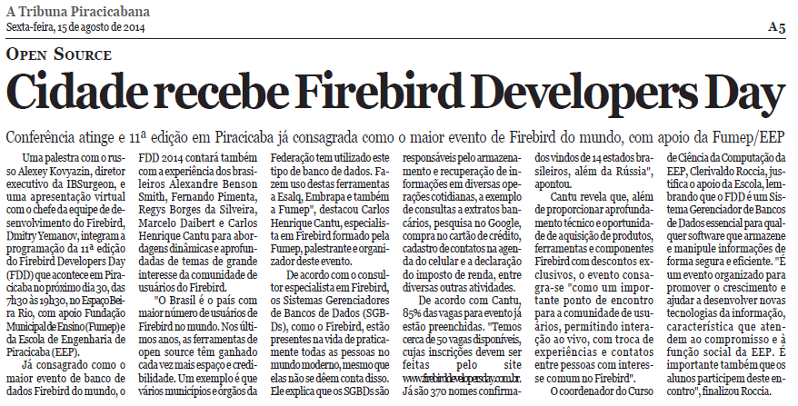 Firebird Developers Day is in today (15/Aug) editions of the “Jornal de Piracicaba” and “A Tribuna Piracicabana” newspapers.